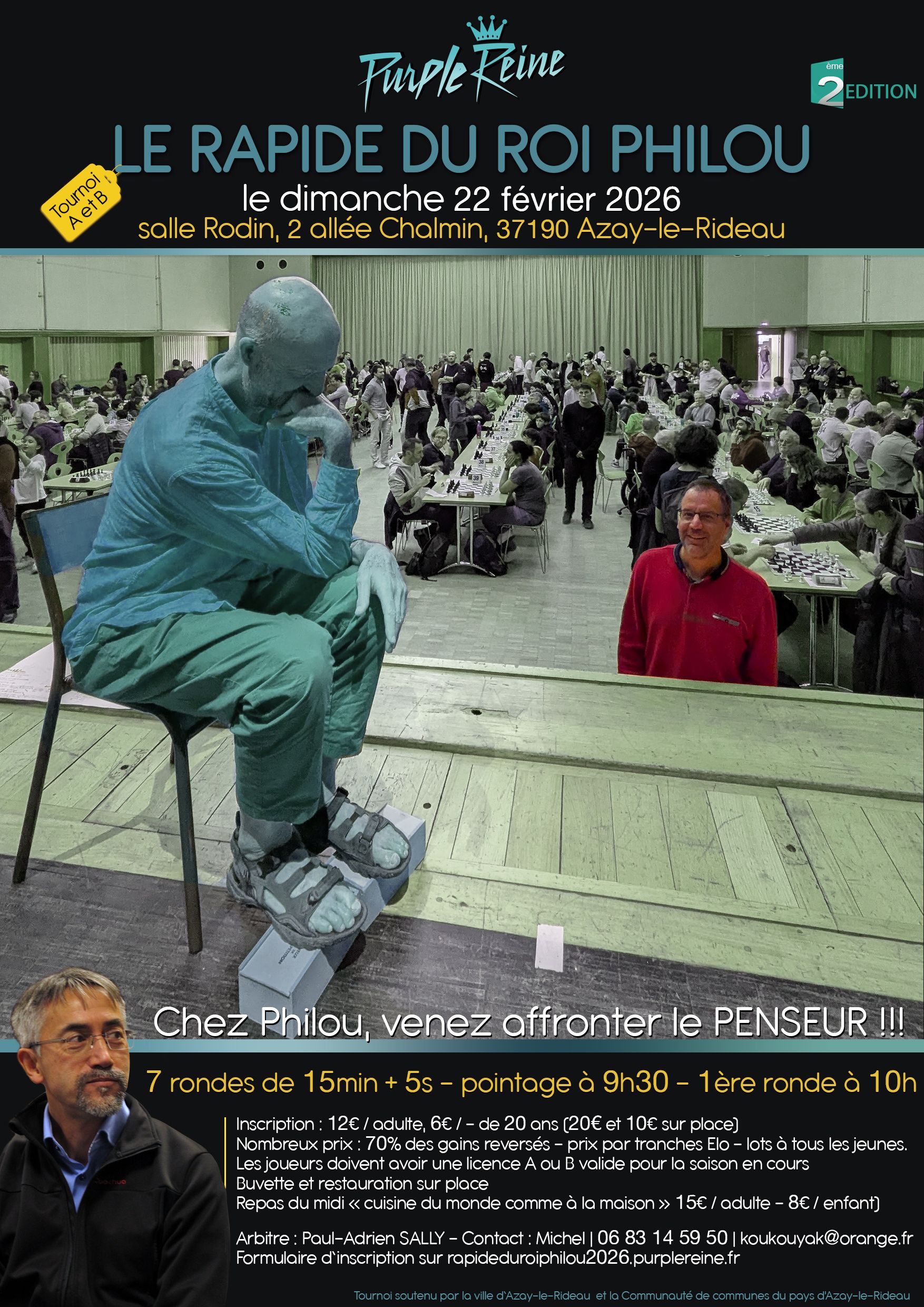 Surfant sur son succès de ses 9 premières éditions, le club d'échecs d'Azay-le-Rideau organise le 10ème Open du Philou, son 2ème: LE RAPIDE DU ROI PHILOU, toujours en hommage à Philippe Vigie, dans la salle Rodin, 2 allée Chalmin, 37190 Azay-le-Rideau.